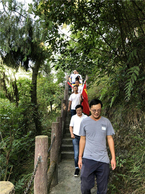 参观了水田寨中央红军总部驻地旧址(花房子)后,全体党员重走了一段长征路。入党积极分子李伟扛着党旗走在前面,“当年红军走过这里的时候,肯定没有这样的台阶,他们就是从没有路走出来的路,我们很多人缺的就是这样的开拓精神”。李伟感慨的说到。