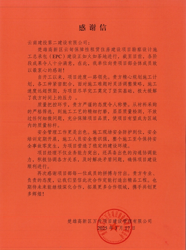 3月17日,由第三直管部承建的楚雄高新区云甸保障性租赁住房建设项目收到了一封来自楚雄高新区万升项目建设管理有限公司的感谢信。