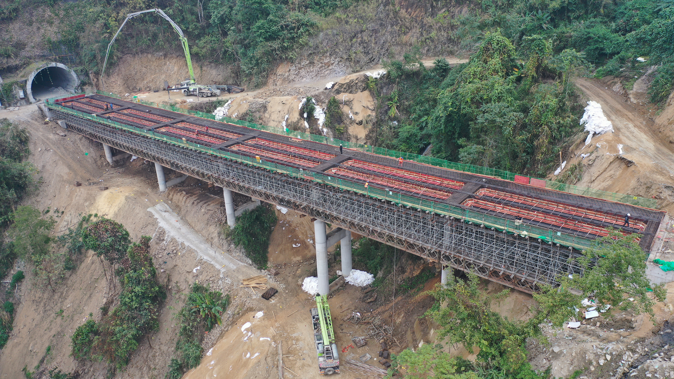 红莫3号大桥位于项目标段起点,左幅现浇箱梁采用组合支架法施工,箱梁混凝土分两次浇筑,首次浇筑箱梁底板和腹板,第二次浇筑箱梁顶板及翼板,此次为首次混凝土浇筑。为保证混凝土顺利浇筑,元绿高速土建五分部提前谋划落实各项工作任务,从箱梁架体基础施工、贝雷片组装、组合支架搭设及预压、箱梁钢筋绑扎、模板安装到混凝土浇筑等各环节,技术人员均全程旁站管控,历经17个小时,最终顺利完成混凝土浇筑。接下来,项目部全体成员将在确保安全和质量的前提下,加快剩余工程施工。
