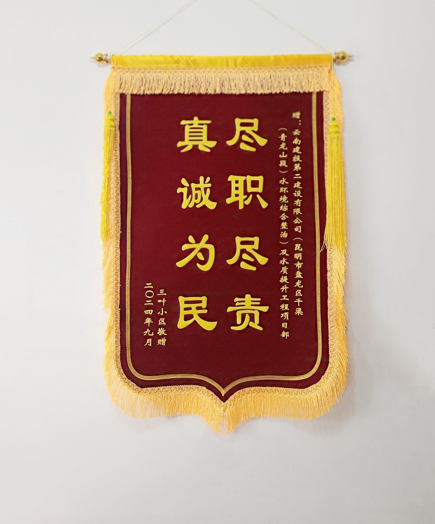 9月9日,第五直管部承建的昆明市盘龙东干渠施工项目收到了来自三叶小区的一面锦旗,锦旗上印有“尽职尽责、真诚为民”几个大字,点赞项目团队高效推进项目建设,为周边小区居民生活提供了便利。