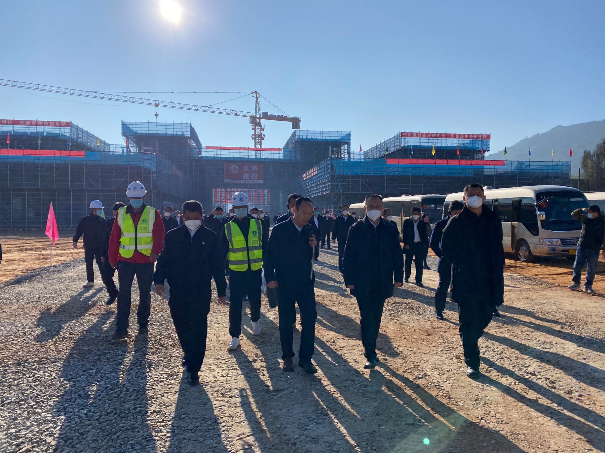 1月7日,普洱市委书记李庆元、市长王刚带领普洱市委常委、市人大、市政协主要领导和九县一区党政负责人、市级机关各部门领导到二公司承建的西盟县大黑山通道建设项目进行现场观摩,二公司公司党委副书记、副董事长、总经理董学友以及项目相关负责人陪同。