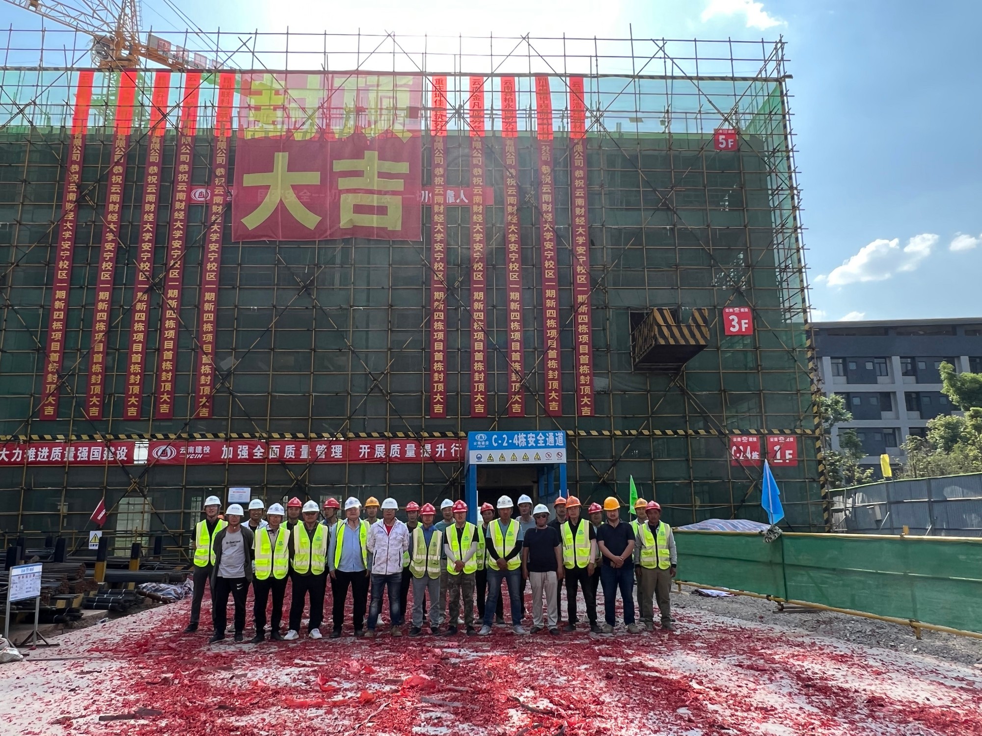 4月29日,伴随着最后一方混凝土浇筑完成,项目施工现场响起一连串欢快的鞭炮声,由公司第十一直管部承建的云南财经大学安宁校区“新四栋”项目首栋主体结构封顶。至此,项目取得阶段性成果。