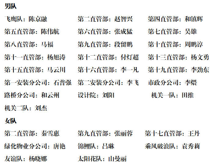 男子组4-8名:第十六直管部、机关1队、市政分公司、第十直管部、第十一直管部(正序)