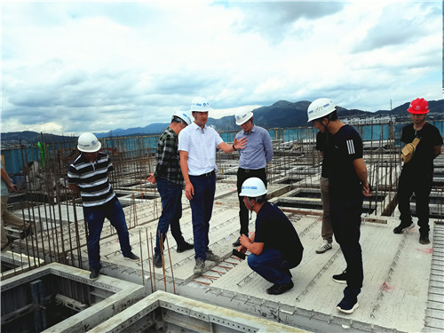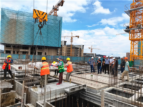 调研领导小组分别到万科城项目施工现场及PC构件生产基地对PC构件配合铝合金模板使用情况、构件生产情况进行检查指导。相关领导就深化设计、标准化生产、构件运输、现场安装、产品成型质量,安装技术保障、成本利润情况等进行询问交流。