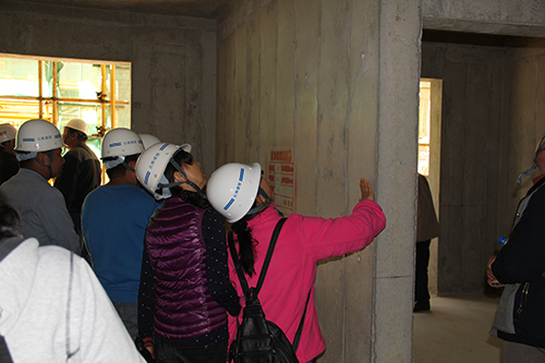 在进入施工现场参观前,项目部管理人员对观摩团人员做了安全交底,介绍进入施工现场过程中应注意的具体事项。参观各栋号施工现场中,安全通道里的各种安全宣传标语和图解内容依次向观摩团展示了施工现场应注意的安全事项和安全操作规范,楼层内部各结构和施工环节的工艺展示不时得到了观摩人员的称赞,各栋号管理公示牌向观摩团详细介绍了楼层的面积、结构、工作内容计划以及具体负责人信心等内容,工具化的钢筋加工棚、工具房、安全防护棚等依次向观摩团展示了定型化设备的优势。在项目总承包部,观摩团来到沙盘展示区,对宜良棚改项目的设计、整体形象以及各区域的功能布局进行了参观。