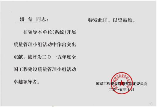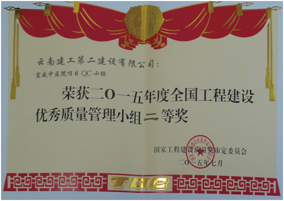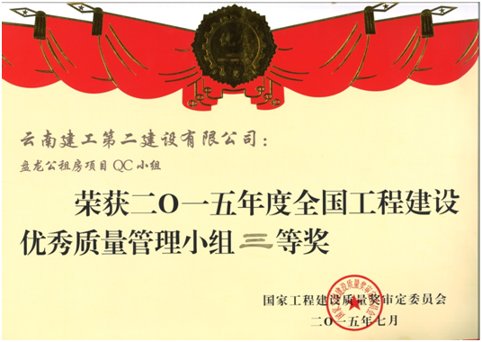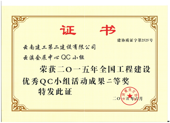 经云南省建筑业协会推荐,公司申报中建协优秀QC小组成果一项,中施协优秀质量管理小组两项,经评审发布云滇会展中心QC小组荣获全国工程建设优秀QC小组活动成果二等奖,宣威中医院项目QC小组荣获全国工程建设优秀质量管理小组二等奖,盘龙公租房项目QC小组荣获全国工程建设优秀质量管理小组三等奖。同时公司荣获全国工程建设质量管理小组活动优秀企业称号,公司总工程师洪洁被评为全国工程建设质量管理小组活动卓越领导者。
